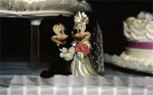 We had a birthday party for my sister Lisa, and while we were there, my mom gave us their gift - they bought us our comforter from Bed, Bath, and Beyond! It's beautiful! They also gave us a little Minnie/Mickey wedding statuette, which we decided to put on the cake table.