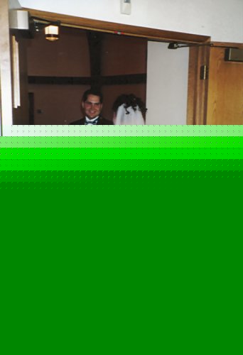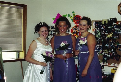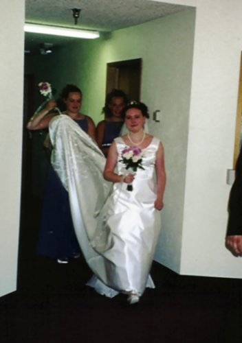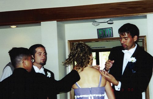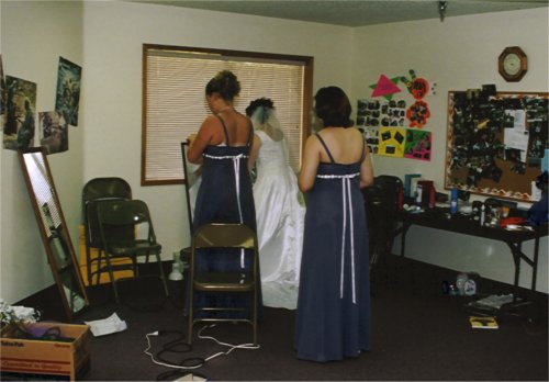 Megan tried the whole morning to call Tiffany, our hair dresser and one of her best friends, and we started to get a little worried that we hadn't heard from her yet. She ended up getting there at the perfect time, and she started on Megan and Lisa and Rina since I was still busy. Every time I went in the room, the girls had more curls!!! I set to putting ribbons on our bouquets (because before they were in the water and I hadn't wanted the ribbons floating in the water. I spread some of the leftover flowers and ivy between the tables at this time, too. I was just almost done with the throw bouquet, and the guys pulled up!!! They were about an hour earlier than I had anticipated, and I wasn't done with what I needed to do! Since I didn't want Eric to see me before hand, I went running to the other room. This turned out to be more frustrating for me, because I was caged up in my classroom with out much to do. Eventually, I made the guys keep Eric in his dressing room so I could go and direct a few last things. My dad and Shelli arrived with the cakes and the food - and found at this point that Safeway had forgotten to give them the rolls for the sandwiches! Luckily, Shelli was going back to town to change before the wedding and was able to get them then. I started to sprinkle rose petals on the tables until Gabe stopped me and told me he could do that for me. He did an excellent job, too :-) I grabbed my flowers and retreated back to my room before Eric came back out.