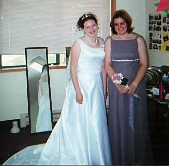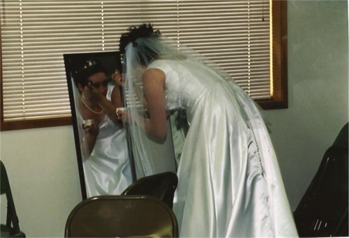 Pretty soon, I was done with my hair, we got my tiara pinned in, the veil on, and it was time to get into my beautiful dress. Finished putting on my under stuff and the girls helped me into the dress. Wow! Time for makeup - I carefully did it myself, and we had about 10 different colors of lavender out that the girls used as well. Thank you, Garden Botanika :-)