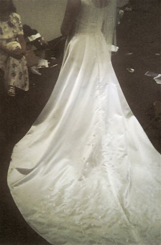 I worked on the throw bouquet from my dressing room and sorted out some papers that needed to be done still. Gabe and Brian came into visit me for a little while. They explained to me about a bet that had been made by the guys about who would marry first. They had each voted for who they had thought would marry first, and then wrote up a contract with rules about who actually did marry first. Depending on how many votes the marrying guy had, he got a certain portion of the pot ($20 each guy). But, Eric hadn't gotten voted for at all, and so since he was getting married first, he got the whole thing! So they wanted to put it in my garter for Eric to find later. I laughed and said I'd be happy to put it on myself for them!
