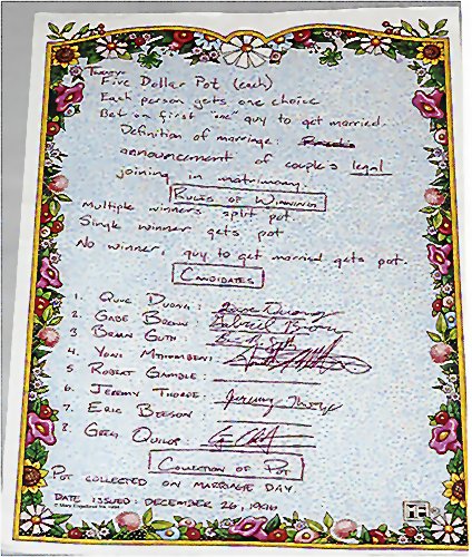 Brian took a chance to explain to the crowd about the bet the guys had made - and explained how since Eric wasn't voted for at all to be the first to marry, he won! Everyone there seemed to think it was fun, and Eric was suprised when Brian told everyone they hid the money on me for him to find :-) Here's pictures of the contract so you can see :-)