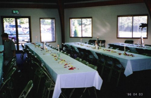 Karen snapped a few pictures of the decorations before people made it into the reception room so we could see how it looked later on. Brian did a great job of announcing all of the essential spots in the reception, and that was great to not have to worry about. Karen, Shellie, and the kitchen staff had everything ready by the time we got out there, and Nancy let us newly married people cut into the line. The food looked beautiful and tasted even better!!!