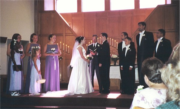 Kristine wore a white dress. Oh, you wanted more detail!!? This dress was exquistely perfect for the occasion. The bodice was fitted with wide sleeveless straps and a scoop neckline, and had flowers and butterflies (each of which came were on seperate material attached to the dress so they seemed to want to fly off the dress) stitched as if they were growing up from the waistline and the hem in the back. The dress was made of a silky satin that flowed beautiful as I walked. A huge line of buttons came all of the way down the back and at the bottom of the buttons, there was a single butterfly. When the dress was bustled up for the ceremony, it had a beautiful shape and showed off the full beauty of the embroidered flowers and butterflies down the entire back. I love my dress and wish I could wear it again!